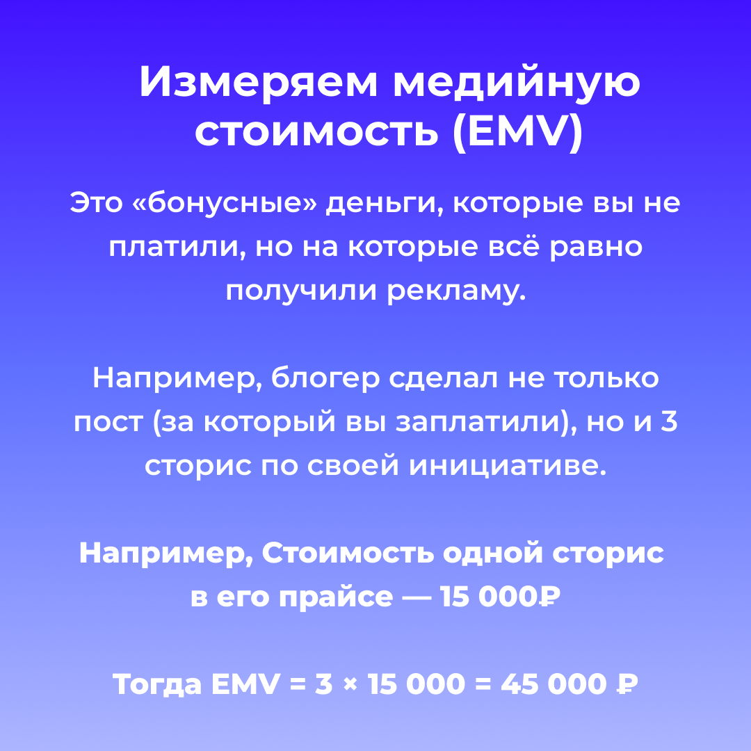 Например, он сделал не только пост (за который вы заплатили), но и 3 сторис по своей инициативе. Стоимость одной сторис в его прайсе — 15 000 ₽. Значит, EMV = 3 × 15 000 = 45 000 ₽ дополнительной ценности.