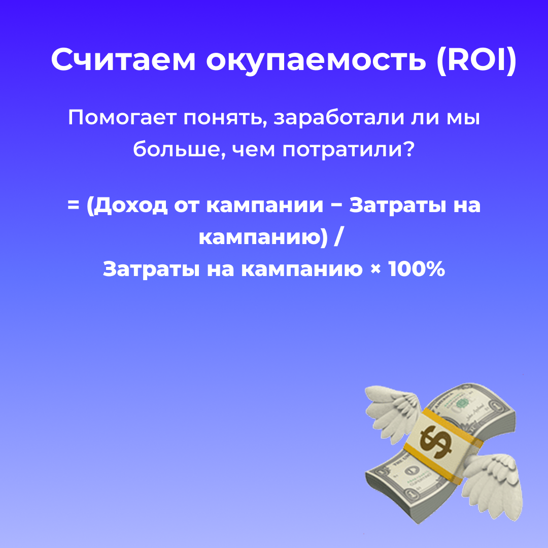 Формула: (Доход от кампании − Затраты на кампанию) / Затраты на кампанию × 100%